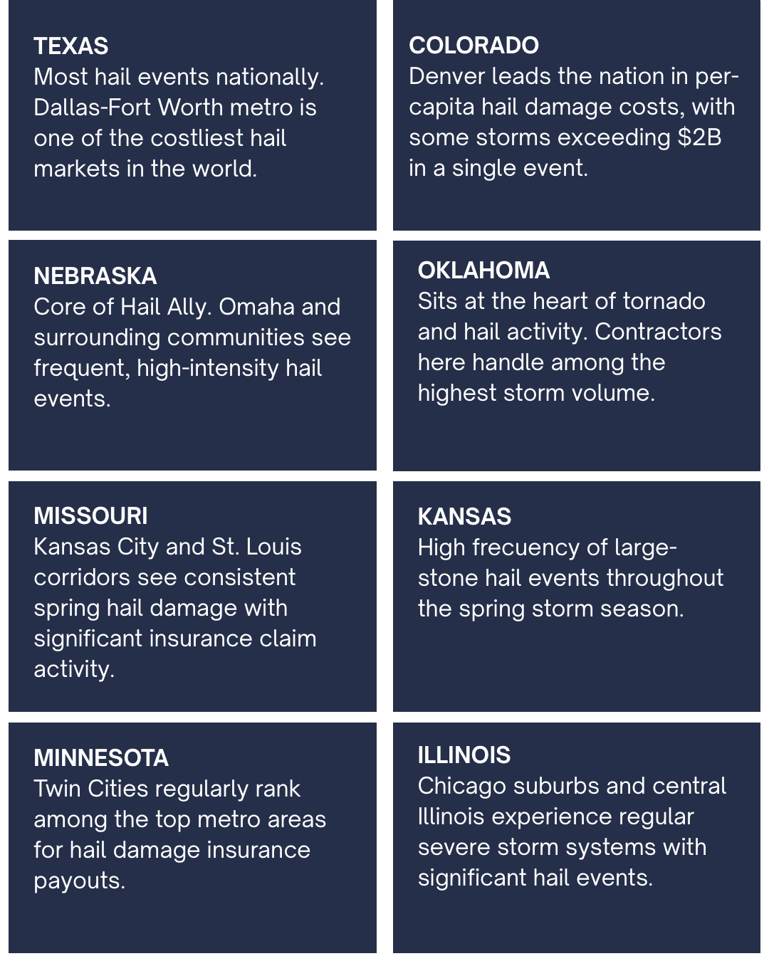 The corridor stretching from South Dakota down through Nebraska, Kansas, Oklahoma and into Texas is so consistently battered that meteorologists dubbed it “Hail Alley.” But hail season doesn’t stop there- the Mid-Atlantic, the Midwest and the Mountain West all experience significant hail activity that generates massive insurance claim volume for roofing contractors every year.